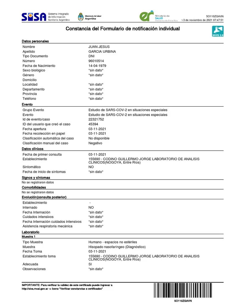 Certificado Sisa Covid 19 : Ayuda En Linea Sisa Sistema Integrado De Informacion Sanitaria Argentino : Es recomendable que la toma de la muestra se haga dentro de los 7 días del inicio de los síntomas.. A las 2 hs de realizado el test. En definitiva, no hay restricciones para ingresar. Se entrega certificado via mail avalando el resultado positivo: Hasta el momento se aplicaron 462.983 dosis del plan "vacunar para prevenir". Entre los 47 casos descartados, 46 corresponden a trenque lauquen y uno (1) a beruti.
